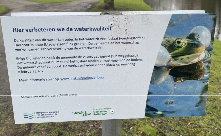 De gemeente kondigde met behulp van een tiental bordjes aan dat de waterkwaliteit van de vijver in het Rozenburgpark op 9 februari 2026 zou worden aangepakt.
